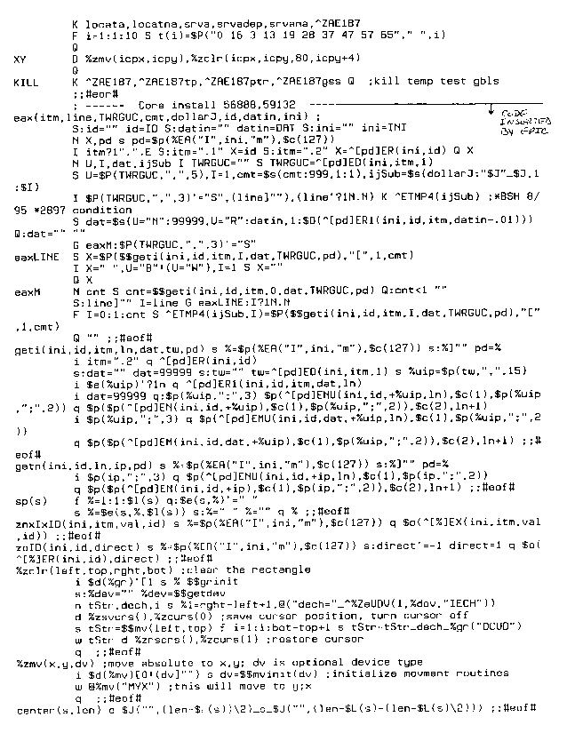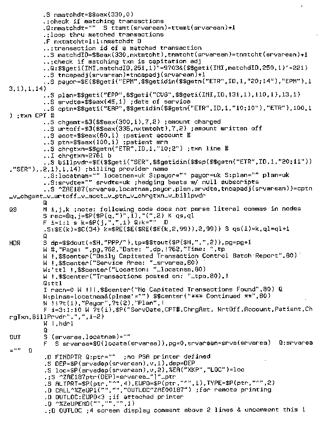 The following sample M[UMPS] routine, ZAE00187, was written for a national HMO running EPIC software. ZAE00187 is a capitated transaction control batch report.